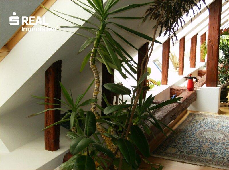 Vom Vorzimmer gelangt man über eine gedrehte Stiege ins Obergeschoß, direkt in einen ca. 75m2 großen lichtdurchfluteten Raum, mit einem Schwedenofen als gemütliche Wärmequelle zur Zentralheizung. Im Anschluss befindet sich ein kleineres Badezimmer mit Dusche und WC, ein Schrankraum, sowie ein Ankleide-/Bügelzimmer mit Stauraum und schließlich in ein besonders großzügiges Schlafzimmer, das im Sommer klimatisiert werden kann. In einem separaten Trakt des Hofes befindet sich ein Gästebereich mit Badezimmer.
