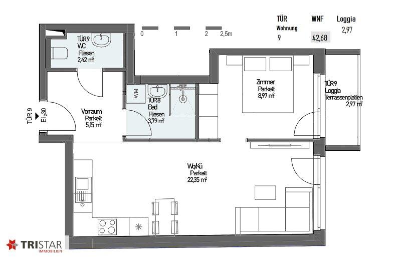 Top 9: WNFL ca. 43 m² (2 Zimmer) + LOGGIA ca. 3 m² + ER (Keller) ca. 2 m²