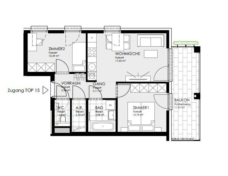 Die Top 5.15 ist eine freundliche 3 Zimmer Wohnung mit einem netten Balkon ( 11 m² ).