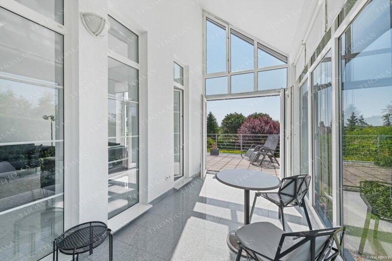 - Two bright conservatories (east & west) with floor-to-ceiling glazing offering panoramic views of the Bisamberg and Vienna