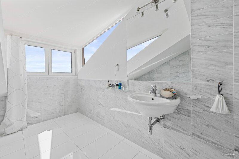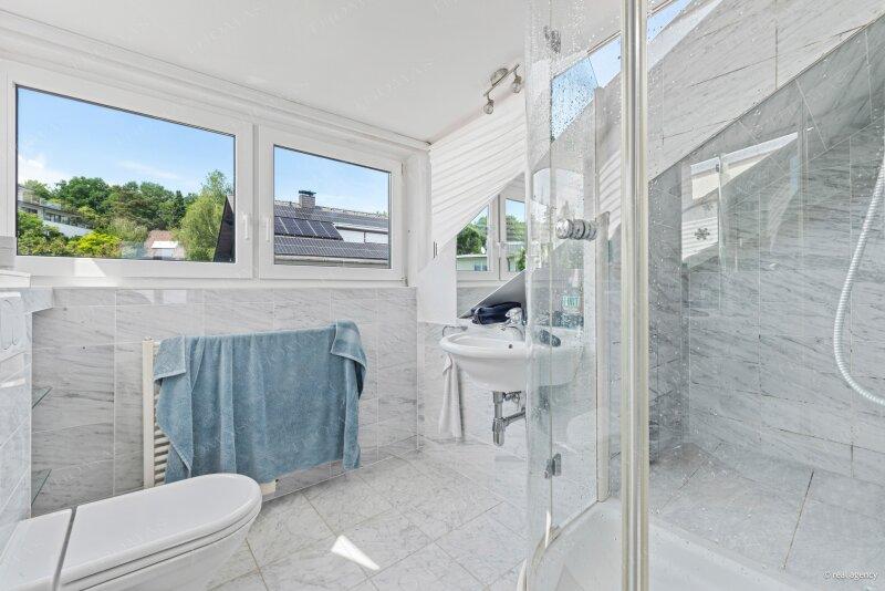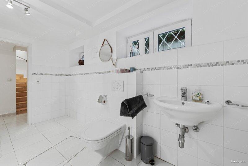 - Badezimmer mit Dusche, Waschbecken, WC, Waschmaschinen- & Trockneranschluss