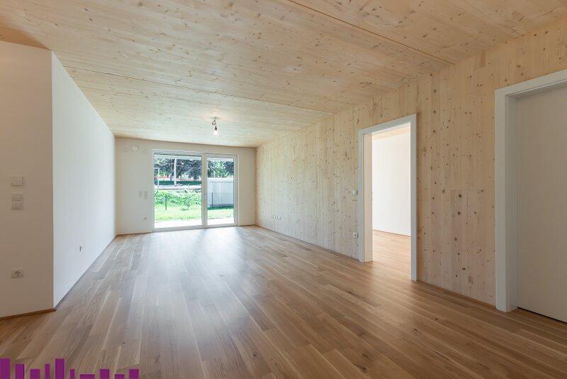 Die Wohnküche mit 18,94 m² ist offen und einladend gestaltet und wird durch eine separate Kochnische mit 5,88 m² ergänzt. Von hier aus gelangt man direkt auf die 15,44 m² große Terrasse, die mit Plattenbelag versehen ist, sowie in den 31,91 m² großen Eigengarten, der zusätzlichen Erholungsraum im Grünen bietet. Eine 5,51 m² große Loggia erweitert den Außenbereich um eine geschützte Freifläche.
