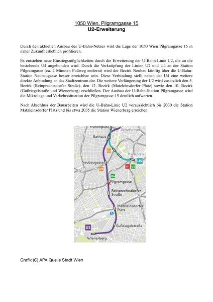 Die Wohnung liegt in der Pilgramgasse im 5. Wiener Gemeindebezirk nahe dem Naschmarkt. Die Liegenschaft verfügt über eine ausgezeichnete Infrastruktur durch Busse und die sich direkt daneben befindende U-Bahn Station U4. Geschäfte des täglichen Bedarfs befinden sich in fußläufiger Umgebung. Auch der umschwärmte Naschmarkt mit seinen vielen Lokalen und Restaurants, mit sowohl regionalen als auch orientalischen Angeboten, ist in ca. 9 Gehminuten erreichbar.