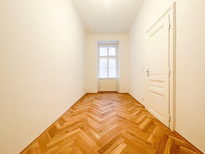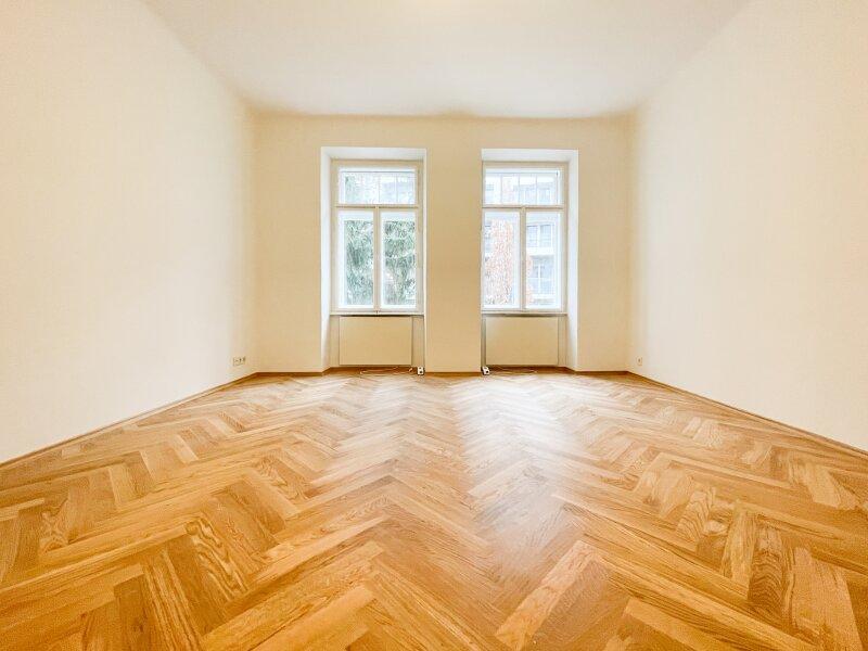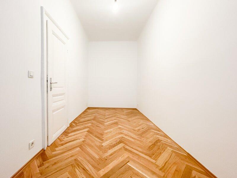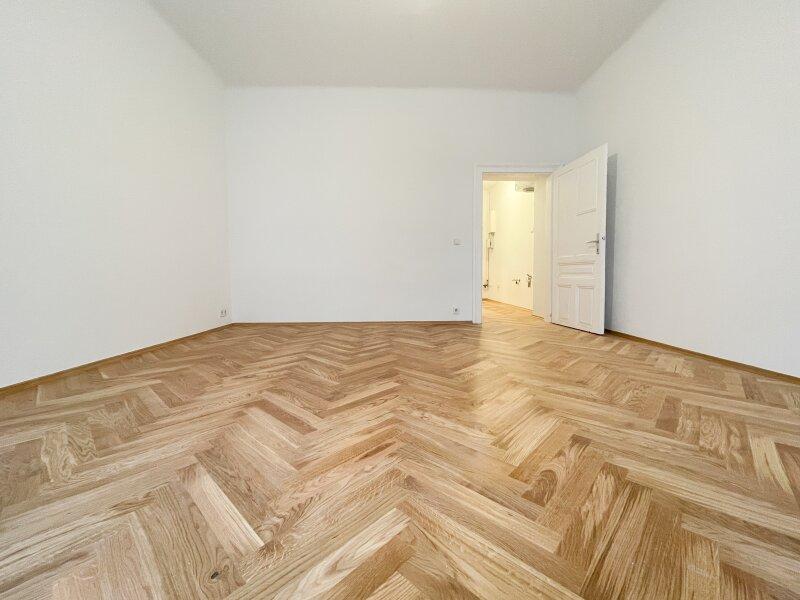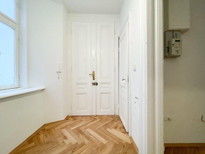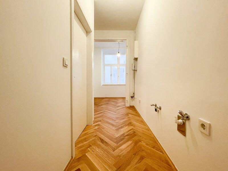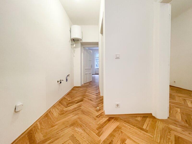 Diese charmante 2-Zimmerwohnung liegt in einem frisch sanierten Gründerzeithaus mit schönen Fassadendetails und hat einen ganz neuen Parkettboden in Fischgrät-Optik verlegt bekommen.