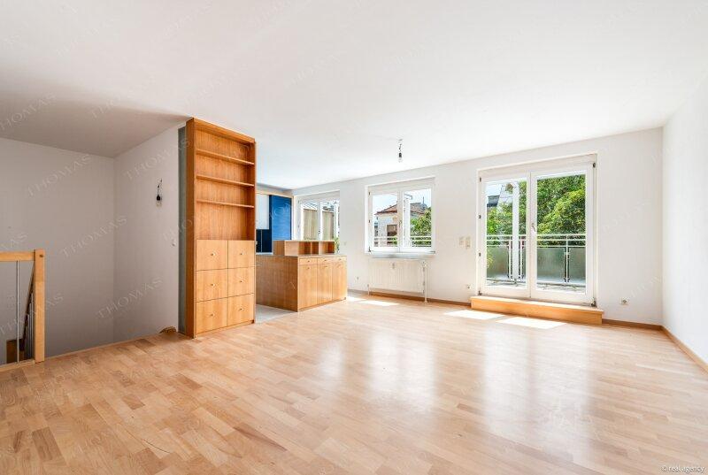 Das Herzstück der Wohnung ist die ca. 20 m² große Dachterrasse ein sonniger Freiraum mit viel Platz zum Entspannen, Genießen oder für gesellige Abende. Ergänzt wird der Außenbereich durch einen weiteren Balkon mit ca. 5 m² auf der unteren Ebene.