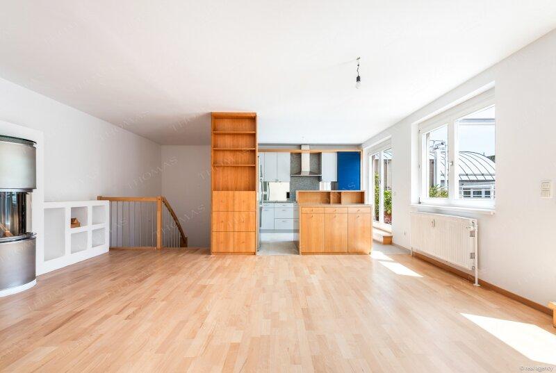 Ein großzügiger Wohnbereich mit Zugang zur Terrasse sowie eine moderne Küche mit Wohncharakter schaffen ein einladendes Ambiente.