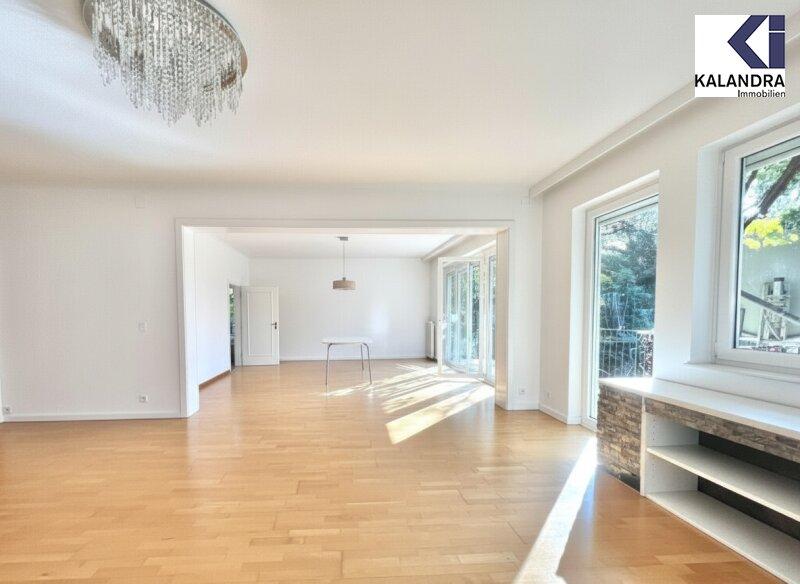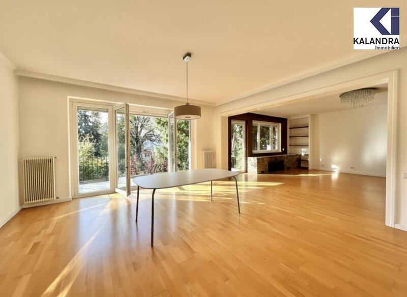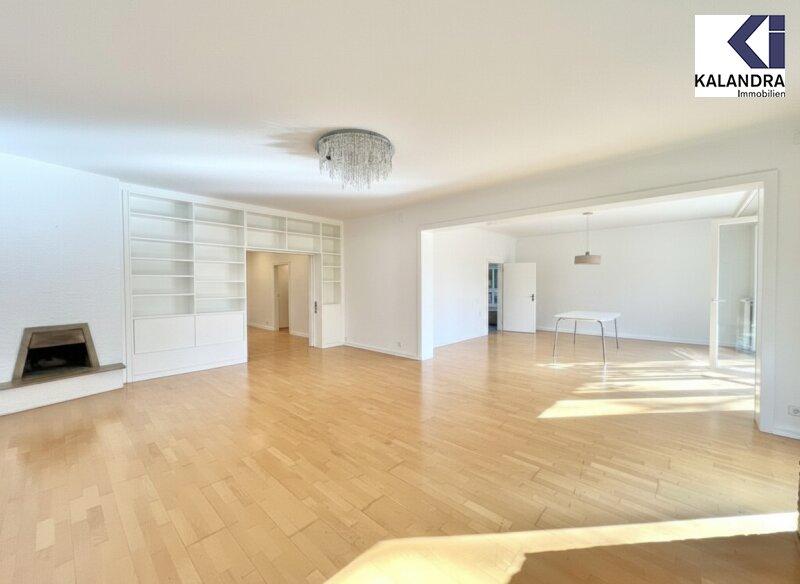 central anteroom, large living/ dining room (approx. 61m²) with exit to a 12m² south-facing, garden-side terrace, kitchen with dining place (approx. 15m²), 3 bedrooms (2 x approx. 13m², 1x approx. 18m²), one smaller kabinett (approx. 9m²) with shower, a bathroom with bathtub and bidet, 2 separate toilets, walk-in cloak-/ storage room.