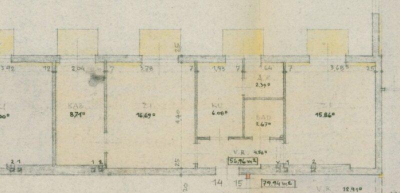 Die ca. 56m² große Wohnung im zweiten Lift-Stock des Hauses hat 3 Zimmer (eines davon ist ein Kabinett), einen Vorraum, eine Küche sowie ein Badezimmer mit Waschbecken, Badewanne und Toilette. Auch ein Abstellraum steht zur Verfügung.