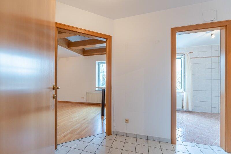 Besonders hervorzuheben sind das lichtdurchflutete Badezimmer mit Fenster, die Einbauküche sowie der separate Schlafbereich im Obergeschoss, der zusätzlichen Stauraum und Platz für einen Homeoffice-Bereich bietet.