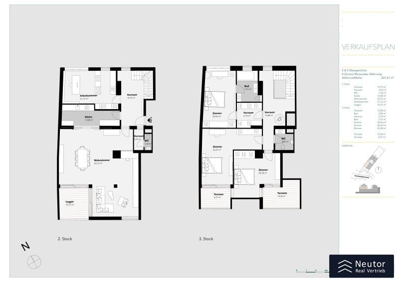 Diese stilvolle 5-Zimmer-Maisonettewohnung im 2. Stock eines modernen Wohnhauses im 19. Bezirk vereint luxuriöses Wohnen mit großzügiger Raumgestaltung und absoluter Privatsphäre. Mit ca. 227,61 m² Wohnfläche, zwei Terrassen und einer Loggia bietet sie ein einzigartiges Wohnambiente. Direkter Liftzugang, lichtdurchflutete Räume und ein nachhaltiges Energiekonzept machen diese Wohnung zu einem exklusiven Rückzugsort.