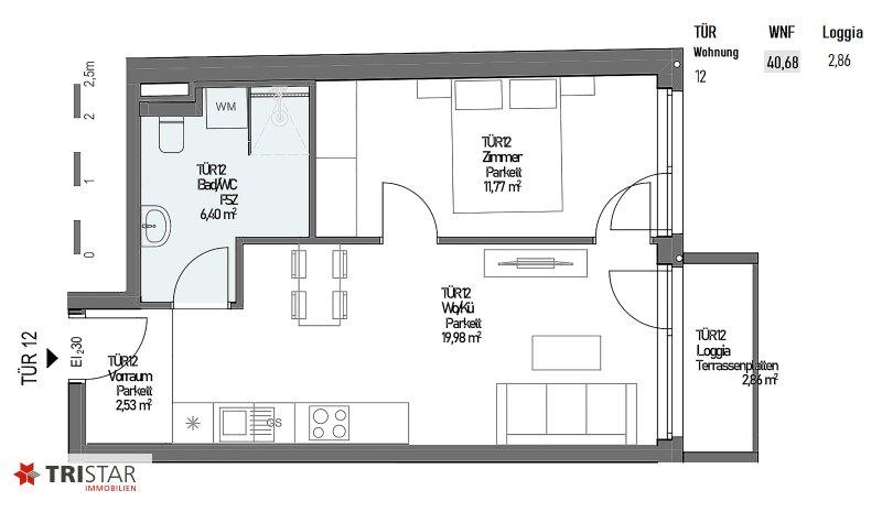 - WNFL ca. 40,68 m² (2 Zimmer) + LOGGIA ca. 2,86 m² + ER (Keller) ca. 1,81 m²