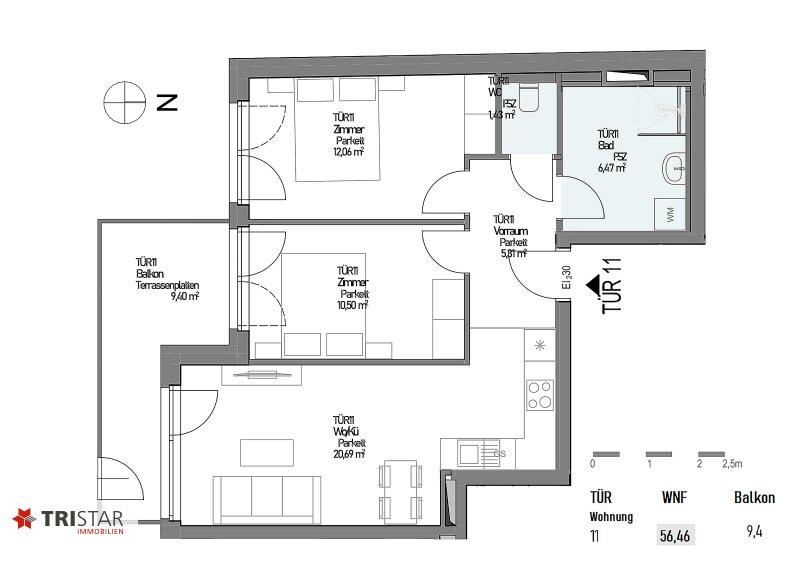- WNFL ca. 55,56 m² (3 Zimmer) + Terrasse ca. 9,40 m² + ER (Keller) ca. 1,74 m²