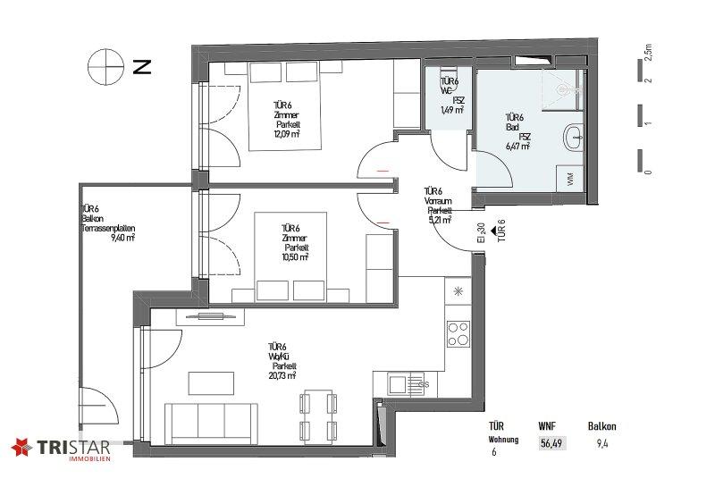 • WNFL ca. 56,49 m² (3 Zimmer) + Terrasse ca. 9,40 m² + ER (Keller) ca. 1,74 m²
