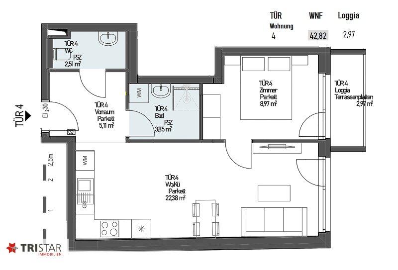 • WNFL ca. 42,68 m² (2 Zimmer) + LOGGIA ca. 2,97 m² + ER (Keller) ca. 1,74 m²