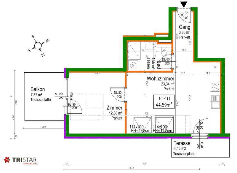 TOP 11: ca. 44,60 m² (2 Zimmer) + Balkon ca. 7,57 m² + Terrasse ca. 4,50 m², Kaufpreis: EUR 279.000