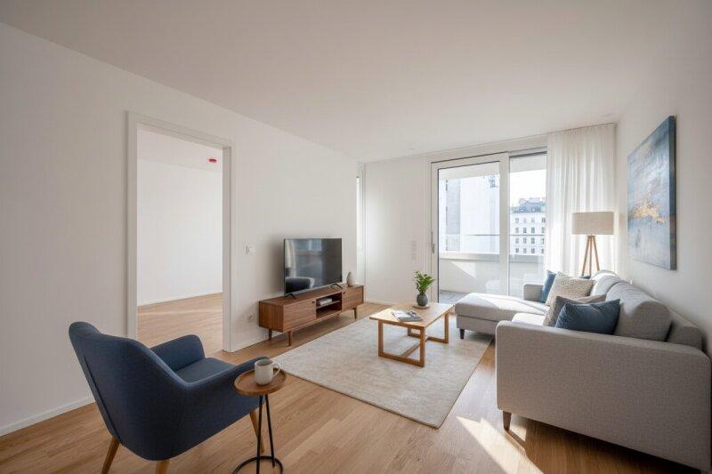 This bright, well-designed, and high-quality 3-room new-build apartment with balcony, approx. 81 m², is available for temporary rent in a unique new development in a prime location in Viennas 6th district!