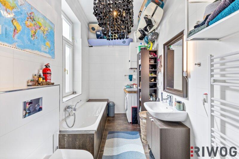 Das Badezimmer ist mit einem Waschbecken, einer Badewanne und einer Dusche, einem Waschmaschinenanschluss, einem WC, einer Lüftung und einem Fenster ausgestattet.