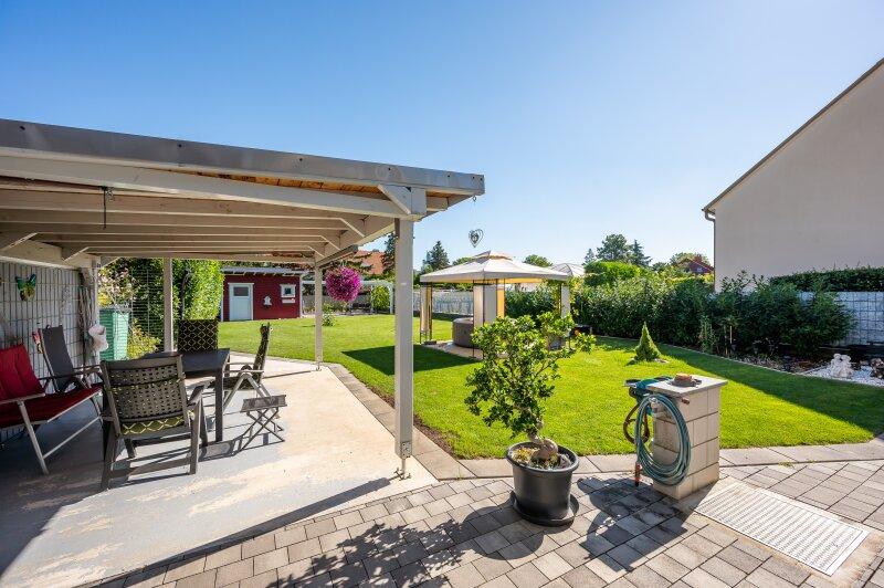 • Ausrichung: Nordost/Südwest, Schatten auf der Terrasse, Sonne im Garten