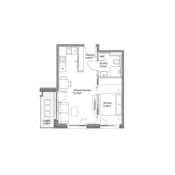 Die ca. 37,84 m² Wohnfläche bietet wie folgt: