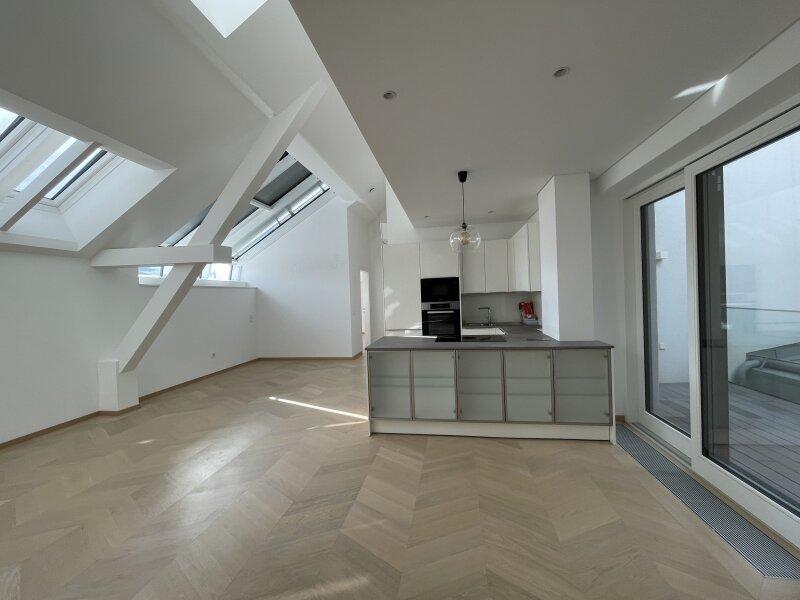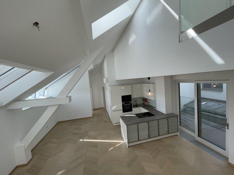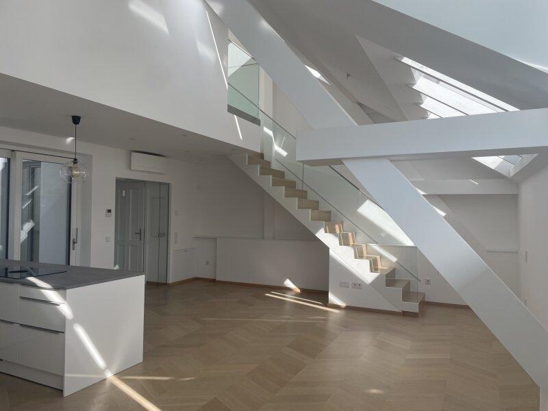 Die Maisonetten-Wohnung besticht neben ihrer raffinierten und modernen Gestaltung ebenfalls mit der zentralen Lage im Herzen von Wien! Die Zugänge innerhalb der Wohnung erfolgen teilweise zentral, wobei Sie direkt im Vorzimmer von einem Abstellraum mit Waschmaschinenanschluss und einem großzügigen Garderobenbereich empfangen werden. Von hier aus gelangen Sie direkt hindurch durch die Wohnküche auf die Terrasse, welche zum Entspannen einlädt. Ein separates Gäste-WC neben dem Eingang, komplettieren diesen Bereich.