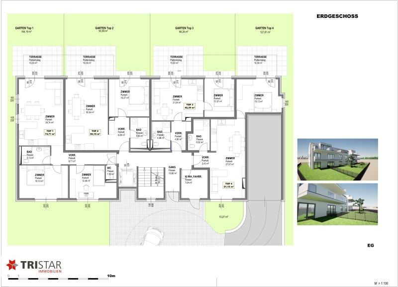 Top 1 (3-Zimmer-Gartenwohnung), gewichtete Fläche: 108,38 m² | Kaufpreis Eigennutzer: € 489.000 | Anlegerpreis netto: € 440.100 | Brutto inkl. 20% MwSt: € 528.120