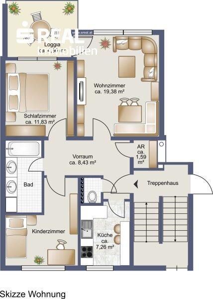 Die Wohnung ist über den Vorraum zentral begehbar, bietet Bad und WC getrennt, einen Abstellraum, eine geräumige Küche, ein ca. 20 m² großes Wohnzimmer mit Ausgang auf die Westloggia und zwei Schlafzimmer.