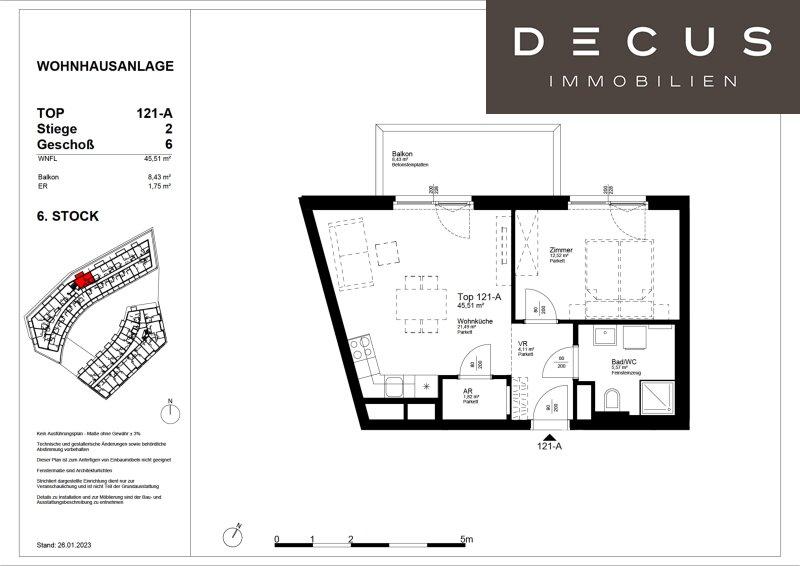 Die Wohnung im Bauteil 2 Top 121 befindet sich im 6. Obergeschoß, ist nordwestseitig ausgerichtet und teilt sich wie folgt auf: