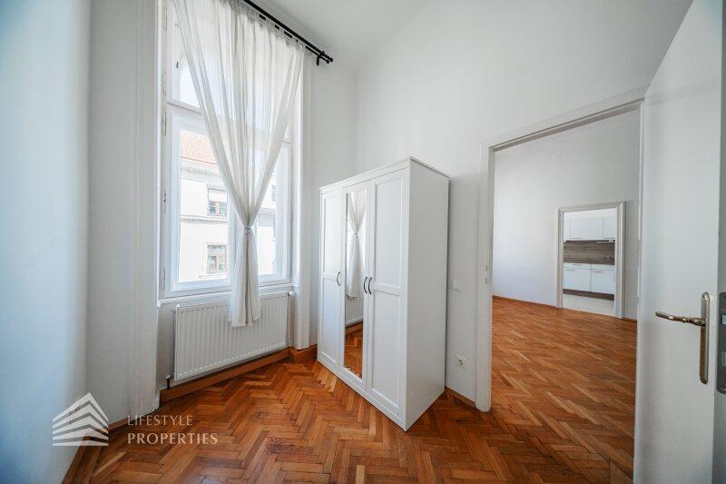 Die Wohnung befindet sich im 2. Stock eines schönen Stilaltbaus aus dem Jahr 1897 und gliedert sich in einen Vorraum, eine Küche, ein Wohnzimmer, ein Badezimmer und ein separates WC. Die Wohnung ist möbliert.