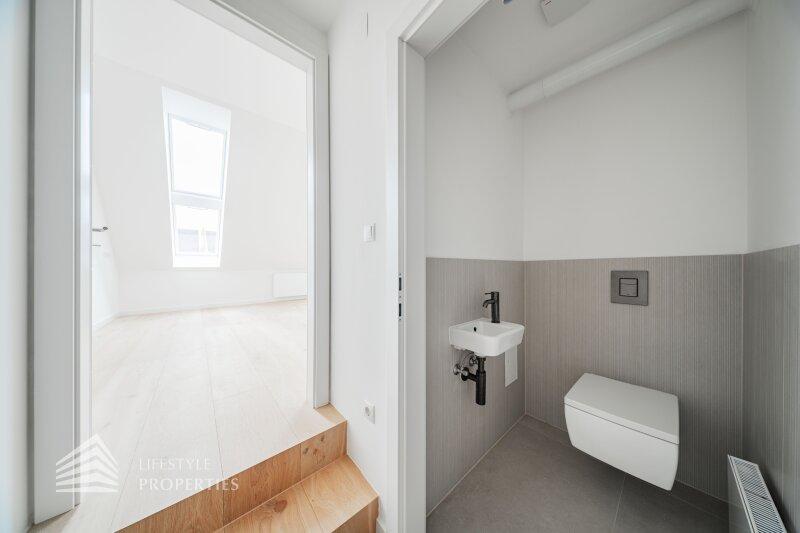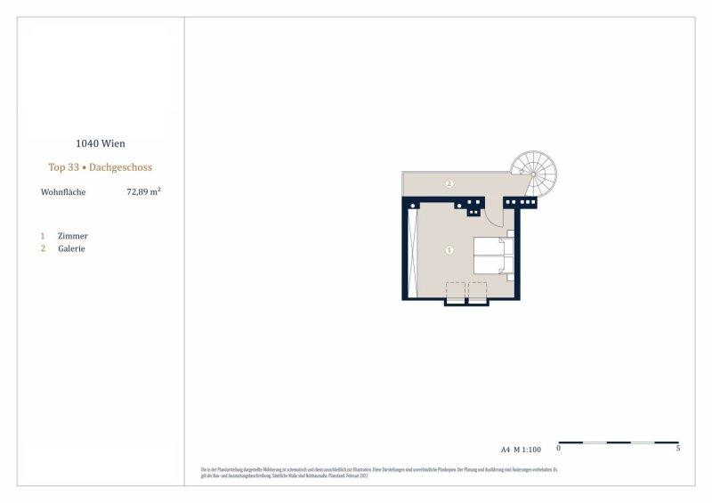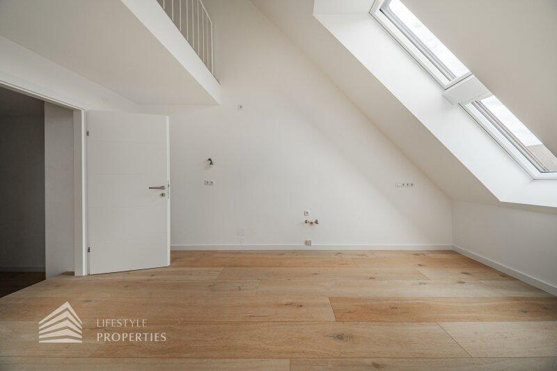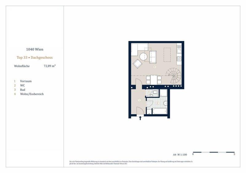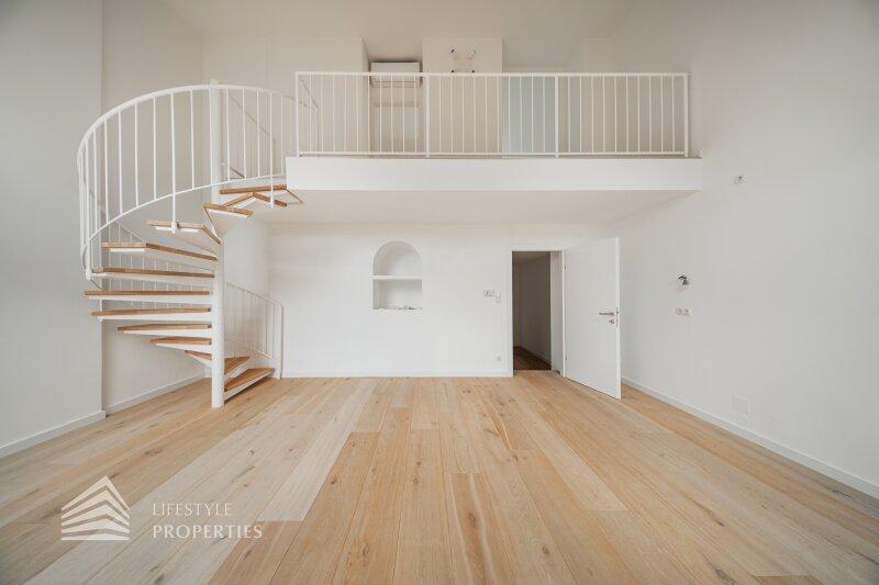 Sie betreten die Wohnung und befinden sich im Vorraum, gerade durch gelangen Sie in die helle Wohnküche. Über eine Wendeltreppe gelangen Sie zum Schlafzimmer und den Galeriebereich, der der Wohnung einen besonderen Charme verleiht. Das Badezimmer ist mit einer Badewanne, einer Dusche und einem Waschbecken ausgestattet. Das separate WC befindet sich auch im Vorraum.