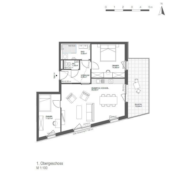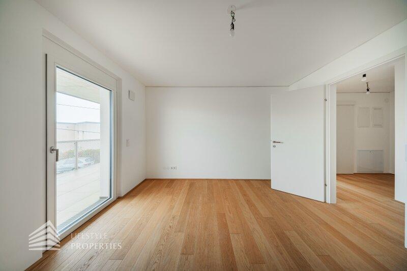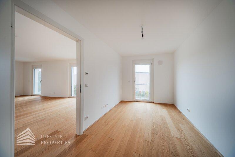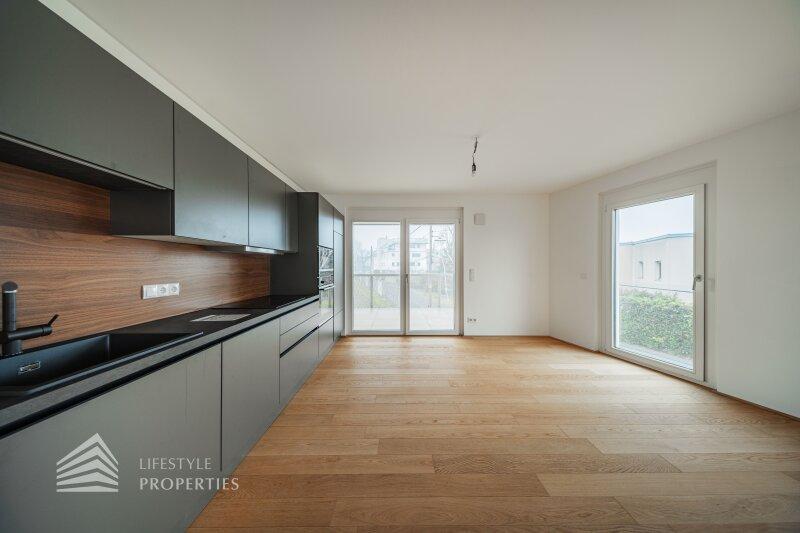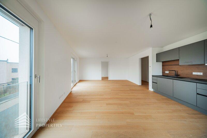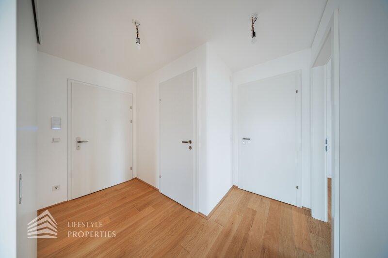 Die Wohnung ist ein Erstbezug, befindet sich im 1. Liftstock und hat eine Größe von ca. 76,30 m², und gliedert sich in eine Wohnküche mit einer schönen, voll ausgestatteten Küche und Balkon, ein Schlafzimmer, einen Vorraum, ein Bad mit Dusche, Waschbecken, Waschmaschinenanschluss und ein separates WC.
