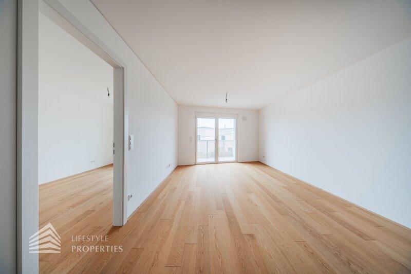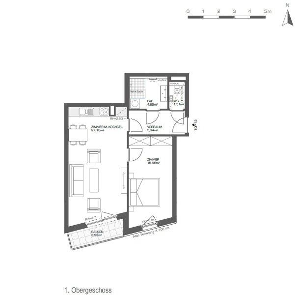 Die Wohnung ist ein Erstbezug, befindet sich im 1. Liftstock und hat eine Größe von ca. 54,83 m², und gliedert sich in eine Wohnküche mit einer schönen, voll ausgestatteten Küche und Balkon, ein Schlafzimmer, einen Vorraum, ein Bad mit Dusche, Waschbecken, Waschmaschinenanschluss und ein separates WC.