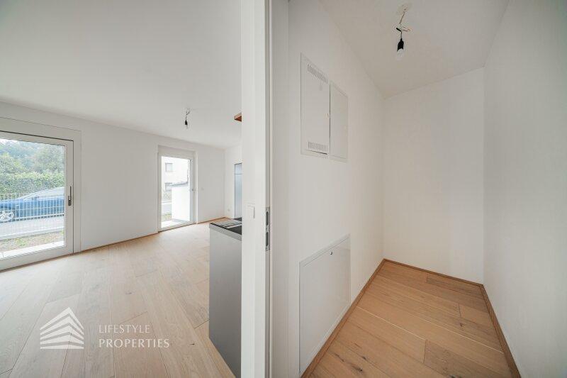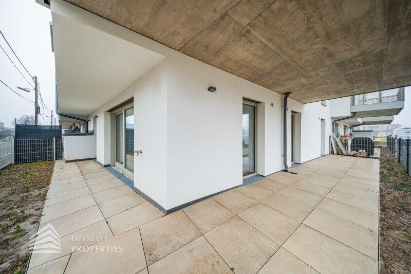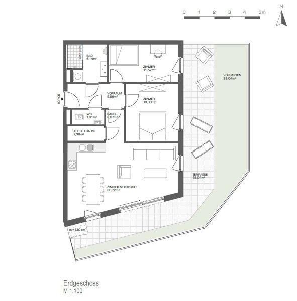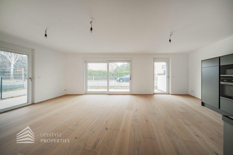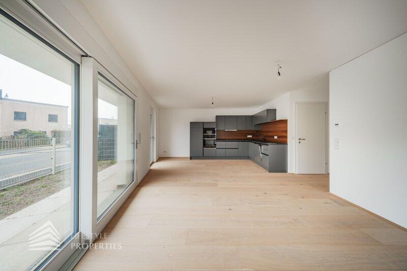 Die Wohnung befindet sich im EG und hat eine Größe von ca. 74,68 m², sie gliedert sich in eine große Wohnküche mit einer schönen, voll ausgestatteten Küche, einen Vorraum, ein Bad mit Dusche, Waschbecken und Waschmaschinenanschluss, einen Abstellraum und den schönen Garten mit Terrasse, sowie zwei Schlafzimmer, und ein separates WC.