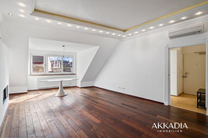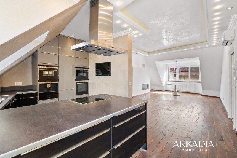 Bereits beim Betreten der Wohnung, wahlweise über das 6. Obergeschoss oder direkt über das Dachgeschoss beides mittels Lift erreichbar , eröffnet sich ein Gefühl von Großzügigkeit, Licht und Offenheit. Der großzügige Wohnbereich das Herzstück dieser Immobilie empfängt mit warmem Eichenparkett, einem offenen Kamin für behagliche Stunden und einer weiten Fensterfront, die nicht nur Tageslicht, sondern auch Weitblick in den Wohnraum holt.