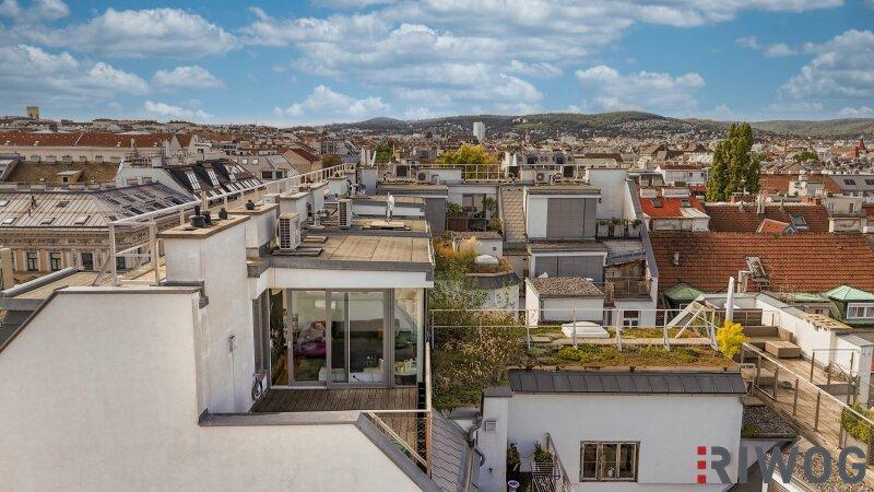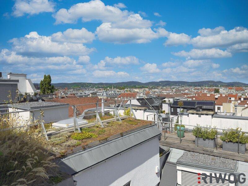 Zum Verkauf gelangt eine durchdachte 4-Zimmer-Dachgeschosswohnung mit zwei großen Außenflächen und einmaligem Ausblick über die Dächer Wiens bis zum Kahlen- und Leopoldsberg.