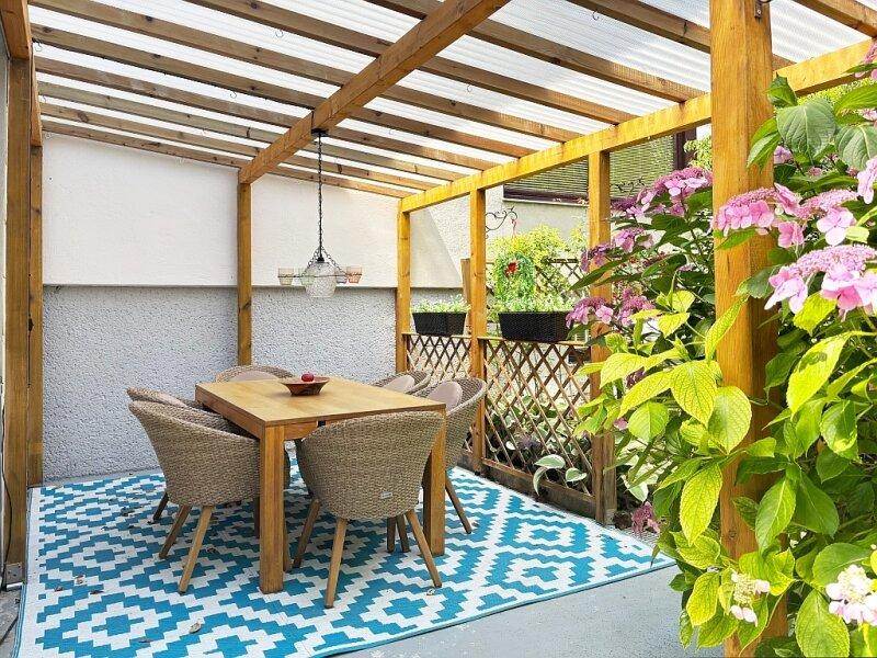 Schon beim Ausgang in den Garten kann man sich an herrlich blühenden Rosen und Hortensien erfreuen. Dann gibt es den Gemüse-Garten, in dem Kräuter, Tomaten, Salat etc. angebaut werden können. Weiters gibt es einen Essbereich unter einer überdachten Terrasse mit herrlichem Grünblick. Direkt davor befindet sich der Grillplatz und gegenüber eine kleine Gartenhütte mit allem nötigen Gärtner-Werkzeug. Durch einen Brombeer-Bogen geht es weiter zu den Obstbäumen und -sträuchern (Pfirsich, Zwetchke, Kirsche, Ribisel etc.). Es gibt ausreichend Platz für Liegestühle oder auch einen Aufstell-Pool. Auch eine Garten-Dusche ist vorhanden. Im hinteren lauschigen Eck des Gartens befindet sich eine gemütliche überdachte Lounge-Ecke, die wiederum von Blühpflanzen umgeben ist und einen wunderbaren Blick auf das eigene Zuhause bietet!