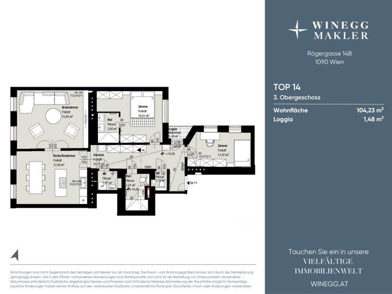 Der lichtdurchflutete Drei-Zimmer-Erstbezug mit ca. 104 qm Wohnfläche zzgl. ca. 1,5 qm Loggia befindet sich auf der 3. Etage und ist straßen- sowie hofseitig ausgerichtet.