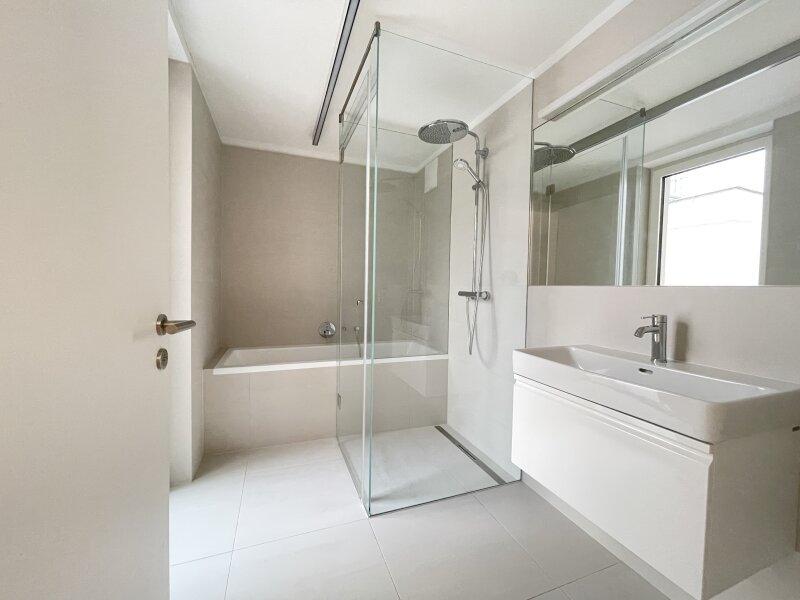 Über den zentralen Gang gelangt man in das helle Badezimmer mit Badewanne, Dusche und zwei Waschbecken, das mit hochwertigen Materialien und natürlichem Lichteinfall überzeugt.