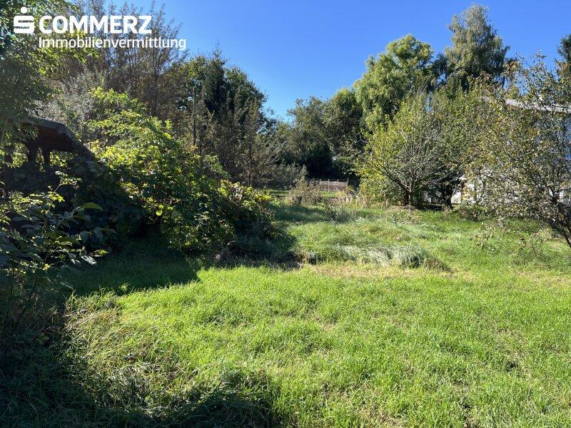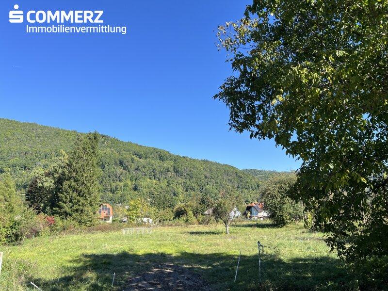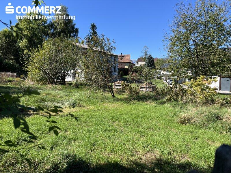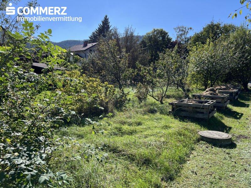 Der Baugrund ist begrünt mit Rasenfläche, Sträuchern und Bäumen und besticht durch einen wunderschönen Blick auf die Gebirgslandschaft.
