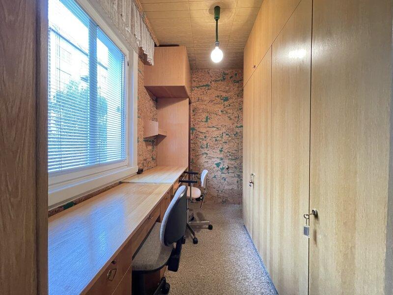 Die Wohnung setzt sich aus den Tops 5 und 6 zusammen und hat dadurch zwei Eingänge. Sie besticht durch einen zentralen Vorraum, von dem aus alle Haupträume separat begehbar sind. Die Küche ist in gebrauchten aber funktionalem Zustand. Vom großzügigen Wohnraum gelangt man zum derzeitigen Schlafraum, zurück zum Gang WC und ersten Badezimmer. Durch einen Durchbruch zwischen den beiden Wohnungen gelangt man in den zweiten Teil der Wohnung mit großzügigen Raum von dem es in die ursprüngliche kleine Küche geht, die jedoch zu einem Arbeitsraum umgestaltet wurde (Anschlüsse noch vorhanden). Ein zweites Vorzimmer und Badezimmer mit WC runden die Wohnung ab.