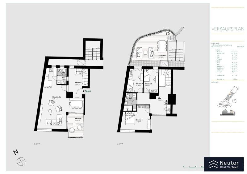 - Zwei Terrassen: Geschützte Lage im 2. Stock und großzügige Terrasse mit Hof-Ruhelage im 3. Stock