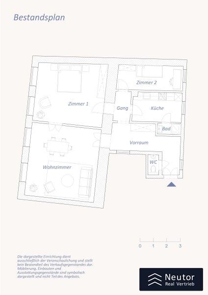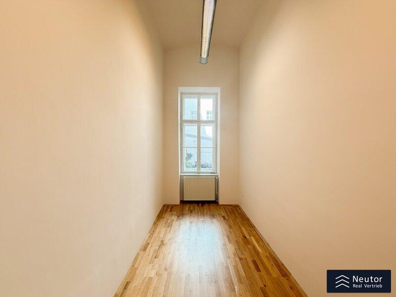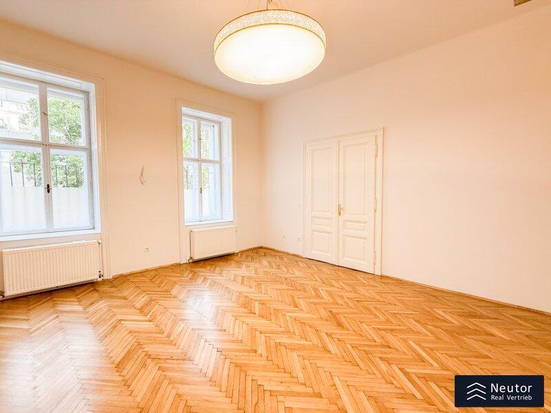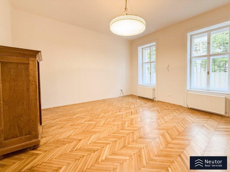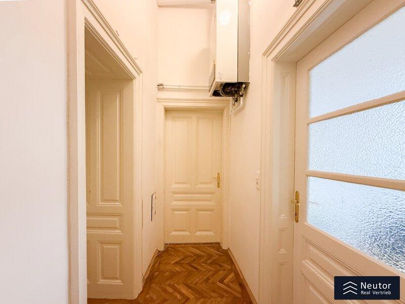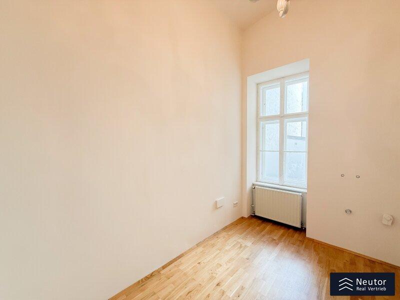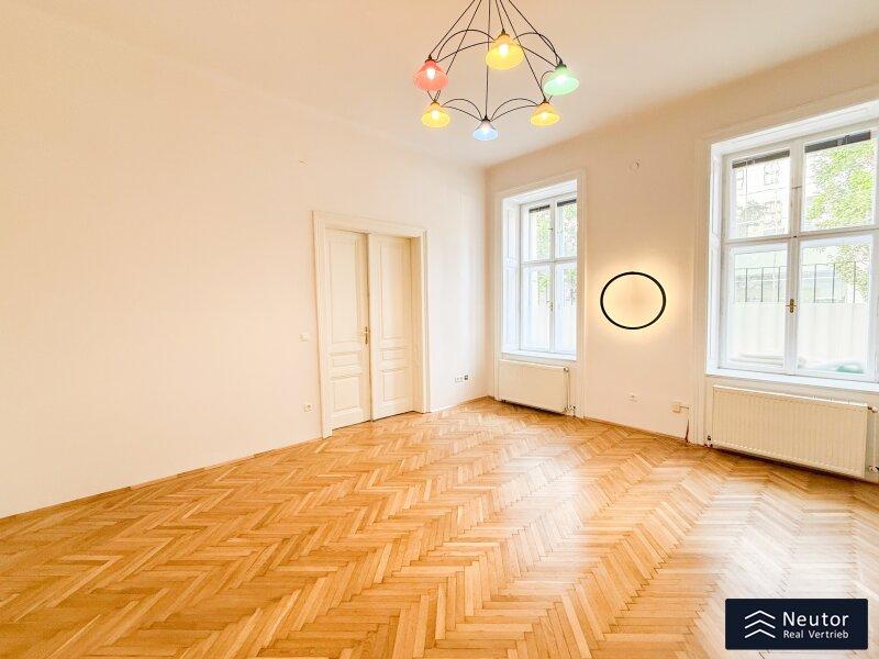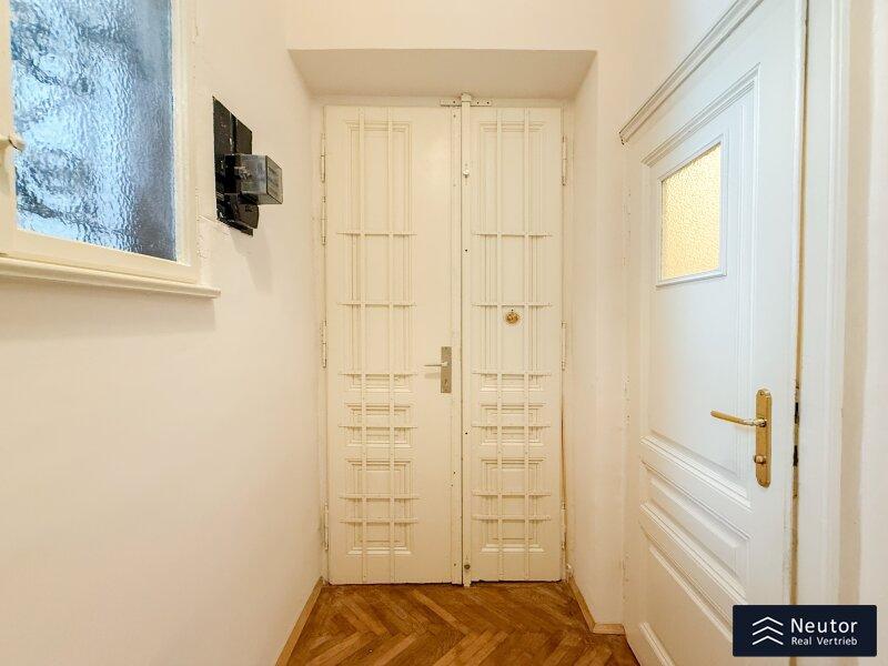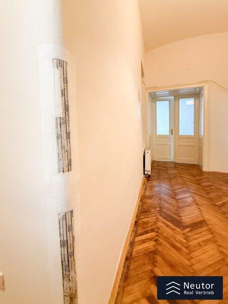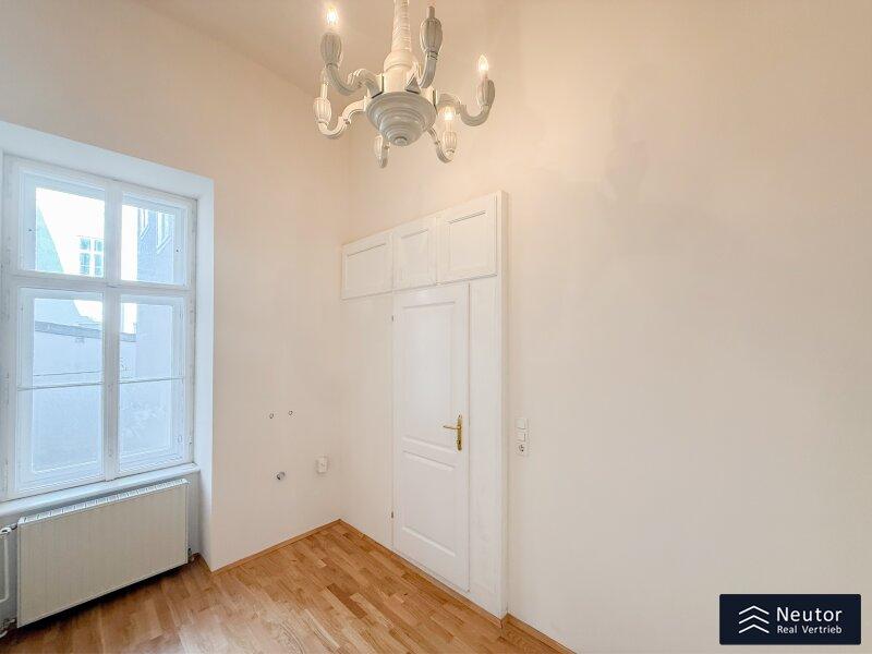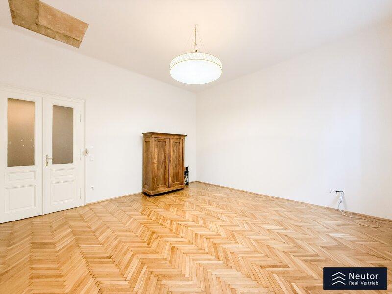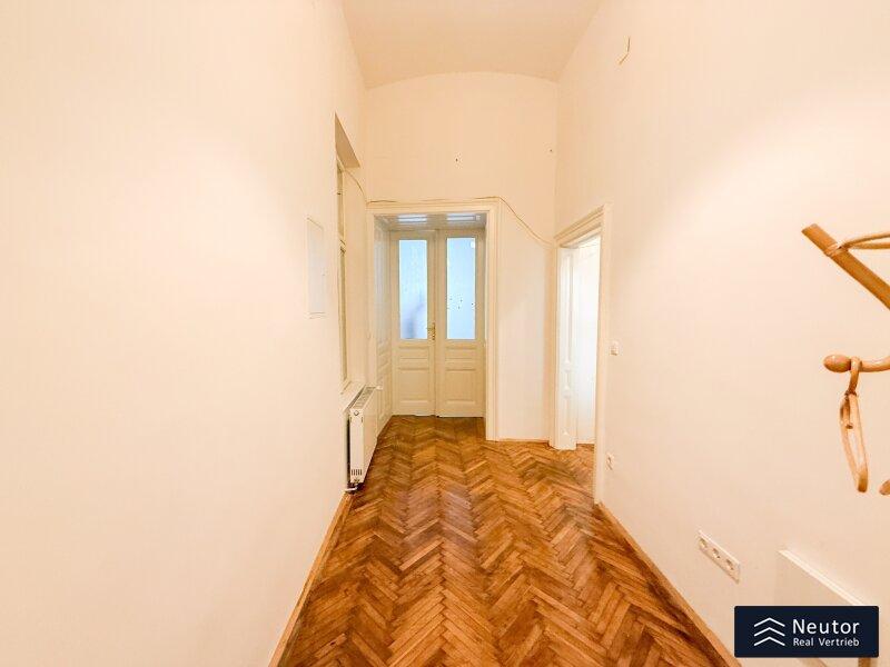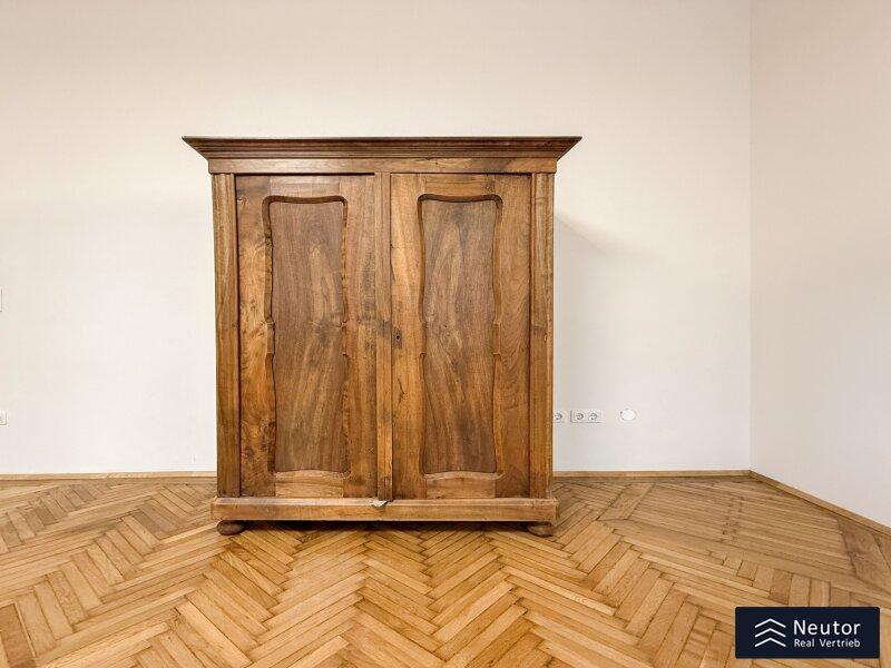Beim Betreten der Wohnung werden Sie von einem großzügigen Vorraum empfangen, der durch seine Weite und Funktionalität sofort ein Gefühl von Großzügigkeit vermittelt. Hier finden Garderobe, Schuhschrank oder stilvolle Dekoration ausreichend Platz, um den Eingangsbereich individuell zu gestalten. Die restaurierten Kastenstockfenster lassen viel Tageslicht einfallen und unterstreichen die ruhige, helle Atmosphäre. Gleich zur Linken befindet sich ein separates WC mit Handwaschbecken ideal gelegen für Bewohner und Gäste. Vom Vorraum gelangen Sie in das lichtdurchflutete Wohnzimmer, das mit seiner großzügigen Fläche, den prachtvollen Flügeltüren, dem edlen Parkettboden und den historischen Fenstern das Herzstück der Wohnung bildet. Der Raum strahlt klassische Eleganz aus und bietet vielseitige Nutzungsmöglichkeiten sei es als stilvoller Wohnraum, Ort für kulturelle Abende oder gemütlicher Rückzugsort. Über einen separaten Gang sowie direkt vom Wohnzimmer aus erreichen Sie das geräumige Hauptschlafzimmer, das ebenfalls durch Helligkeit und großzügige Dimensionen besticht. Hier ist ausreichend Platz für ein großes Bett, Stauraum und sogar eine kleine Leseecke. Ein weiteres Highlight ist das vielseitig nutzbare Kabinett, das über einen separaten Flur zugänglich ist. Ruhig zum Innenhof gelegen, eignet es sich ideal als Home-Office, Gästezimmer, Lernraum oder kreativer Rückzugsort. Die separate Küche ist funktional vorbereitet: Alle Anschlüsse für eine individuelle Einrichtung sind vorhanden, ein Fenster sorgt für gute Belichtung und Belüftung ideal für ein angenehmes Raumklima beim Kochen. Direkt angrenzend befindet sich das Badezimmer, ausgestattet mit Dusche und Waschbecken alles, was für den täglichen Komfort notwendig ist. Die durchdachte Raumaufteilung macht diese Wohnung zu einer flexiblen Lösung für unterschiedlichste Lebensentwürfe ob als WG, stilvolle Stadtwohnung oder Kulturdomizil. In den letzten 1015 Jahren als Büro genutzt, verfügt die Wohnung über eine Wohnwidmung und wurde mit viel Feingefühl revitalisiert. Historische Elemente wie Kastenstockfenster, elegante Parkett und elegante Flügeltüren wurden erhalten und harmonisch mit modernem Wohnkomfort verbunden.