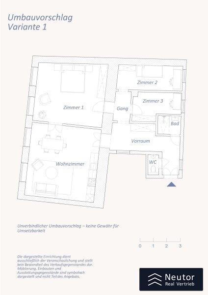Hier finden Sie drei Vorschläge, wie Sie die Wohnung umgestalten können es liegt jedoch keine Baubewilligung vor.