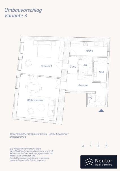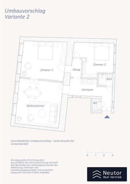 Variante 2: Das Badezimmer ist weiterhin bequem über den Vorraum zugänglich. Die Küche befindet sich ebenfalls am Vorraum. Ihnen stehen somit insgesamt drei Zimmer zur Verfügung, wobei Zimmer 2 besonders großzügig gestaltet ist eine attraktive Grundlage für flexible Wohnlösungen.