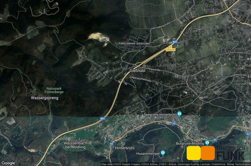 Die Gemeinde Gießhübl liegt im Süden von Wien auf 410 m Seehöhe nahe des Naturschutzgebietes Föhrenberge. Die einzigartige Lage punktet mit Weitblick sowie den Spazierwegen durch den Wienerwald. Der nächstgelegene Supermarkt (Billa) befindet sich ca. 100 Meter entfernt. Arzt und Schule im Ort sind ebenfalls bequem zu Fuß erreichbar. Dank der relativen Nähe zur A21 erreicht man das Wiener Stadtzentrum mit dem Auto in ca. 25 Minuten. Die Busstation Gießhübl Friedhof der Linien 258, 261 und 262 ist nur eine Minute Fußweg entfernt. Dies ermöglicht auch an Wochenenden eine gute öffentliche Anbindung in Richtung Bahnhof Mödling und Bahnhof Liesing (Liesinger Platz). Die Fahrzeit zur SCS, Österreichs größtem Einkaufszentrum, beträgt lediglich 12 Minuten, den Flughafen Wien-Schwechat erreichen Sie über die A21 und S1 in etwas mehr als 20 Minuten.