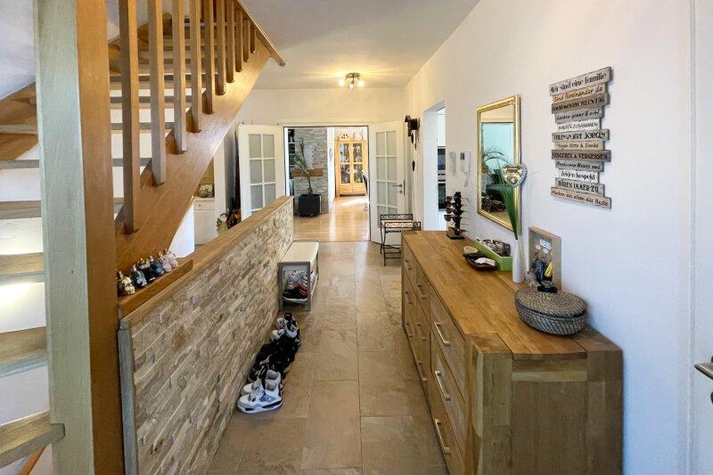 Mit einer Wohnfläche von ca. 194,88 m² bietet dieses 2016 weitreichend sanierte Haus ausreichend Platz für Ihre Familie und Gäste. Sie betreten das Haus durch eine einladende Diele, die Ihnen sofort das Gefühl von Zuhause vermittelt. Die sechs hellen und freundlichen Zimmer sind optimal geschnitten und bieten vielseitige Nutzungsmöglichkeiten sei es als Schlafzimmer, Arbeitszimmer oder Spielzimmer für die Kinder. Die großen Fenster sorgen für lichtdurchflutete Räume und ein angenehmes Wohnklima. Die komplett ausgestattet Küche ist separat begehbar und über eine Durchreiche mit dem Esszimmer verbunden. Das Wohnzimmer ist durch eine unterbrochene Mauer optisch vom Esszimmer getrennt. Für kuschelige Wintertage befindet sich im Wohnbereich ein offener Kamin!