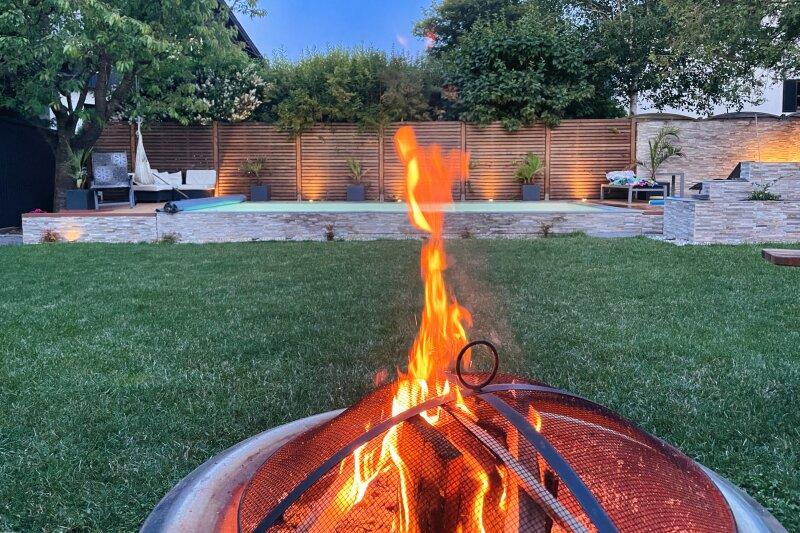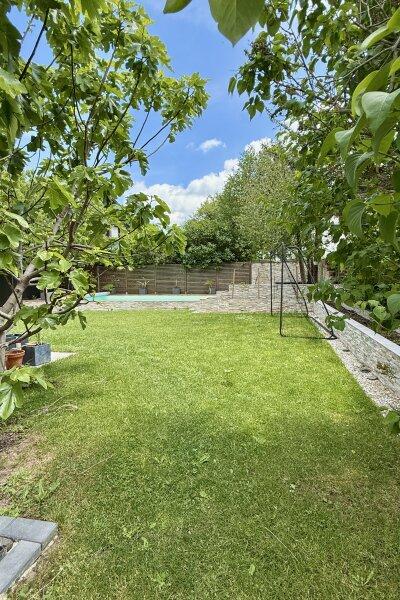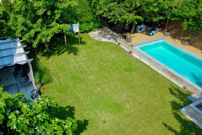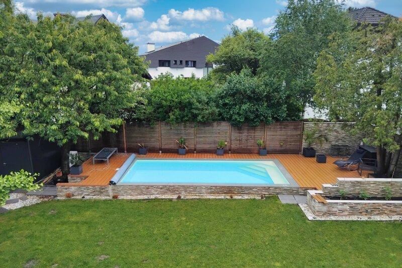 Der Gartenbereich wurde 2020 völlig neu gestaltet: Komplette Gartenbewässerung inkl. Sickerschacht, Pool-Landschaft mit einem 34.000 Liter Salzwasserpool und Wärmepumpe. Die Pooltechnik ist bequem zugänglich in einem Gerätehaus verbaut.