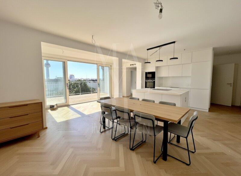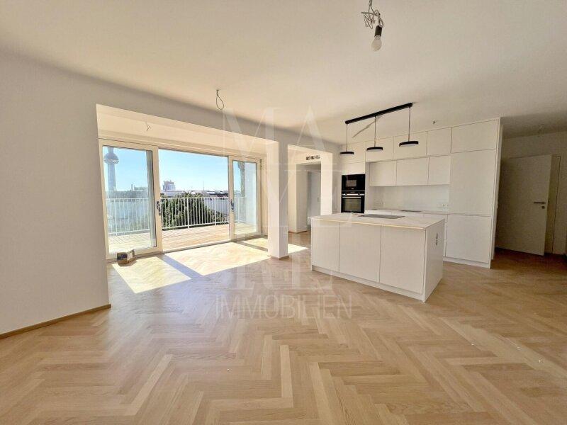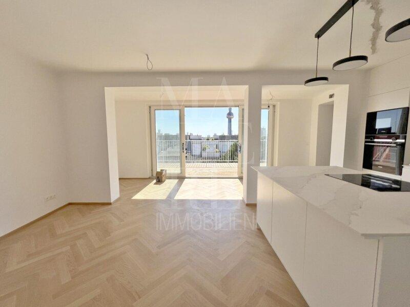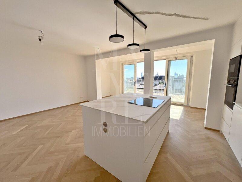 Vorzimmer, WC, sehr geräumige Küche mit Essplatz (ca. 40m2) mit Zugang zur Terrasse ( 20m2)- unverbauter Fernblick bis zum Stephansdom.