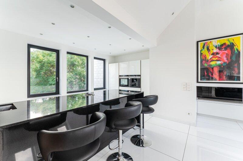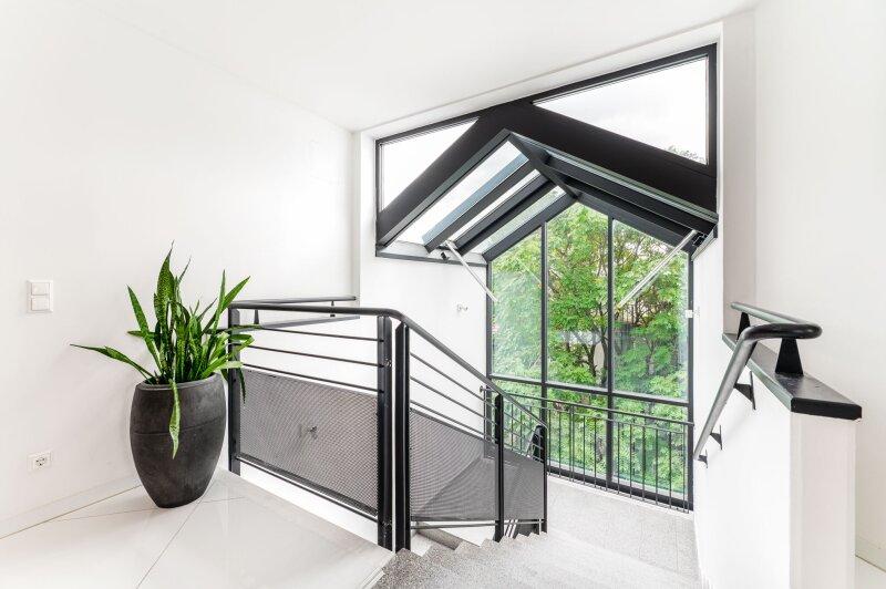 Der eigene Lift bringt Sie direkt in das Hauptgeschoss, wo Sie ein repräsentativer Eingangsbereich empfängt. Hier setzt eine eindrucksvolle Lichtkuppel ein architektonisches Highlight und erfüllt den Raum mit natürlichem Licht.