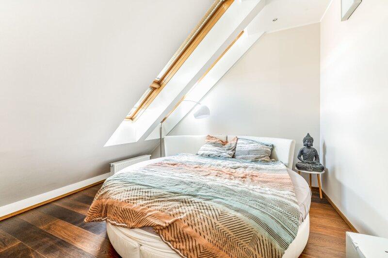 Von hier aus öffnet sich der weitläufige Wohn- und Essbereich, der durch offene Strukturen, großzügige Fensterflächen und markante Dachschrägen das stilistische Zentrum der Wohnung bildet. Die angrenzende Küche orientiert sich in Richtung eines ruhigen, begrünten Innenhofs und verbindet Funktionalität mit einer angenehmen, einladenden Atmosphäre.