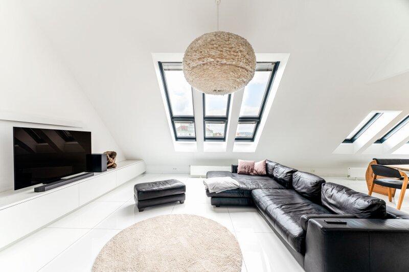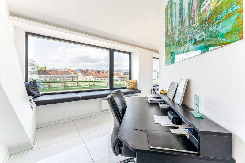 Besonders beeindruckend sind die Sitzecken mit faszinierendem Panoramablick über die Dächer Wiens, die den Puls der Stadt spürbar machen. Ergänzt wird dieser Bereich durch einen kleinen Arbeitsbereich, der sich harmonisch in das offene Raumkonzept einfügt.